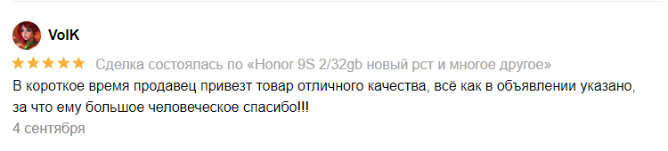 Сделка состоялась по «Honor 9S 2/32gb новый рст и многое другое»