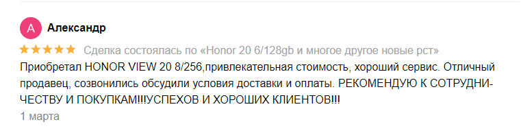 Приобретал HONOR VIEW 20 8/256,привлекательная стоимость, хороший сервис. Отличный продавец, созвонились обсудили условия доставки и оплаты. РЕКОМЕНДУЮ К СОТРУДНИ- ЧЕСТВУ И ПОКУПКАМ!!! УСПЕХОВ И ХОРОШИХ КЛИЕНТОВ!!!